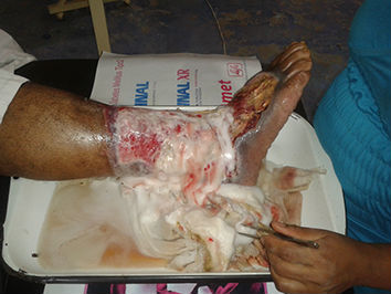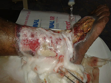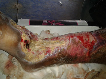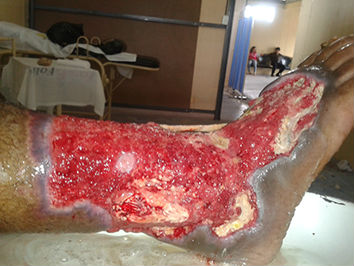Este es el caso de un paciente diabético que padecía concomitantemente de úlcera varicosa en el tercio medio de cara anterior de pierna derecha, que por mal control de su diabetes y del problema varicoso se infecta la úlcera extendiéndose en sentido caudal hacia la parte baja de pierna y cara superior del pié. El paciente entra en sepsis con una herida que afecta la pierna en su mitad inferior prácticamente en el 70% de su circunferencia, y ambas zona peri maleolares.