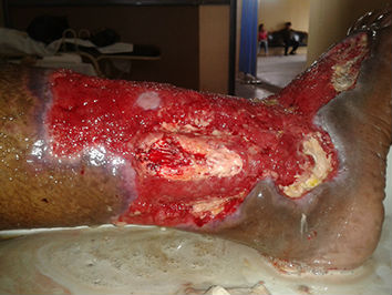 La granulación es activa, las flechas señalan los extremos sangrantes del primero y cuarto metatarsos.