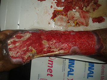 Esta foto es tomada el mismo día que la anterior, la diferencia es porque en esta la herida ha sido limpiada quirúrgicamente mostrándose el verdadero estado de los tejidos. La recuperación de la vitalidad es evidente, se advierte mucho tejido vivo.